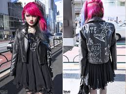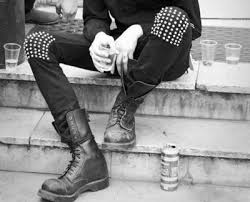 Elements: leather, skinny jeans, studs, ripped denim, chains, graphic tees, motorcycle boots/military boots, black, skulls.